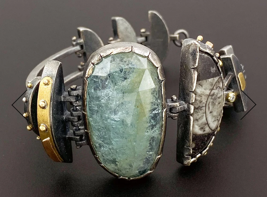 Like water itself, aquamarine ranges in color from the included blue cabochon Karen Bandy used for this ring (right) to the faceted Caribbean blue Petra Class for this necklace to the murkier, icy blue of Janine DeCresenzo paired with ancient fossils in her bracelet (below).